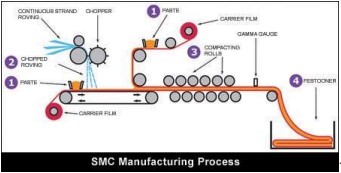 Process : Sheet Moulding Compound (SMC) is a compression moulding compound often used for larger parts where higher mechanical strength is needed. SMC is a fibre reinforced thermoset material. Glass reinforcement is between 10% and 50%, and glass length is slightly longer than Dough Moulding Compound (DMC) - between 1/2-inch and 1-inch (25mm).